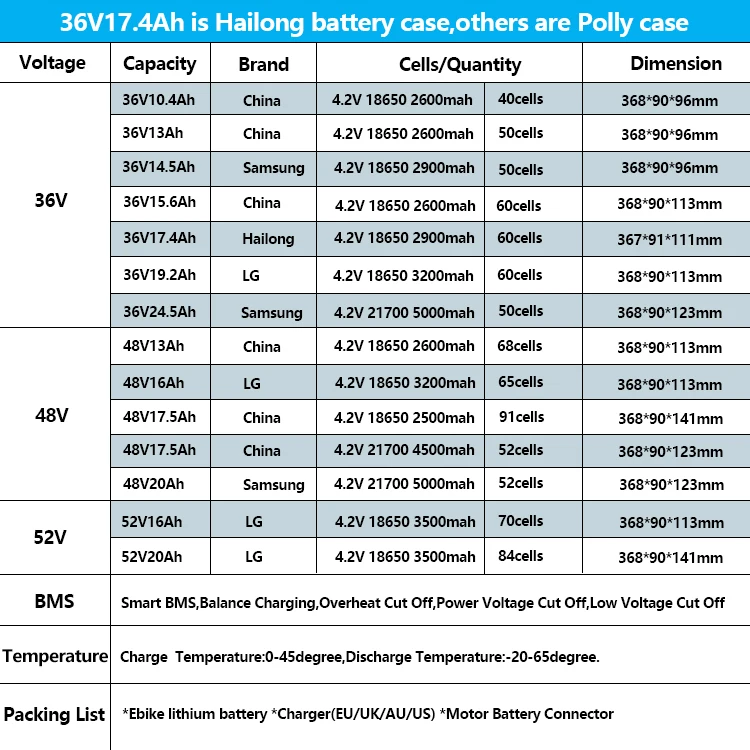 48V: 13AH-CN/16AH-LG/17.5AH-CN/20AH-Samsung