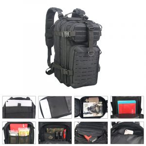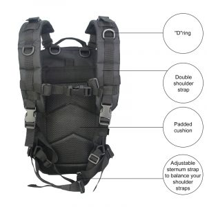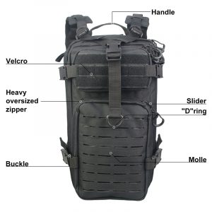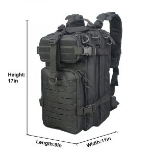 THE BAG: The bag is a compact backpack featuring four main exterior compartments plus a quick access Velcro compartment behind the lumbar panel. The front, sides and bottom feature modular (MOLLE) loops for attaching extra pouches or hanging gear. The back of the main compartment includes a zippered pouch designed to hold a hydration pouch, with ports on the top to access the drinking tube. Bag military Modular (MOLLE) loops throughout to attach external pouches or hang additional gear Four main exterior compartments, plus one rear velcro compartment. Bag military Measures 13″(L) x 9″(W) x 18″(H)